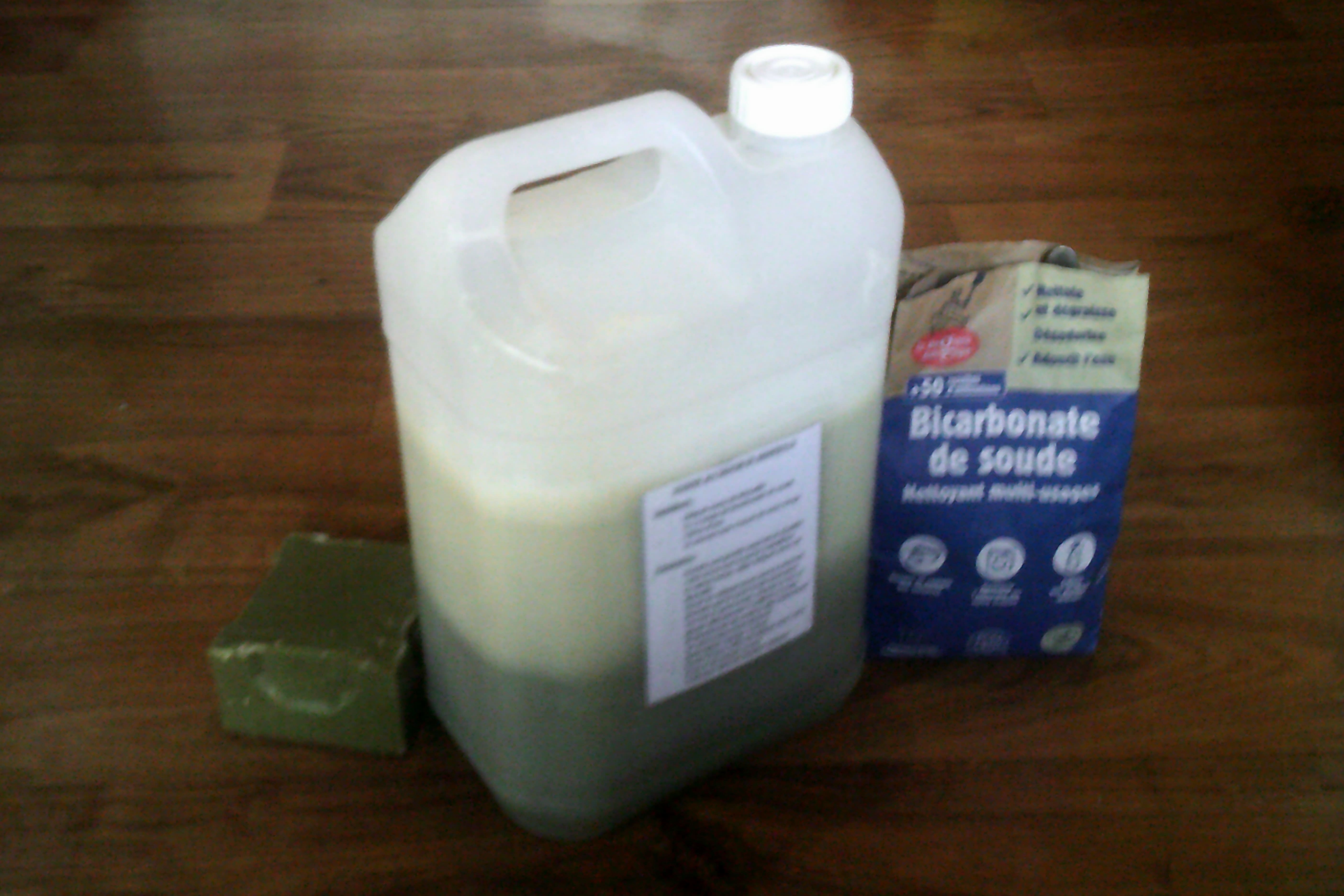 Savon de Marseille : 0,90€ (pour 100g) + Bicarbonate de soude : 0,06€ (pour 3 c. à soupe) + Eau et gaz : moins de 0,04 € = 1€ pour 2 Litres = 0,50€/L