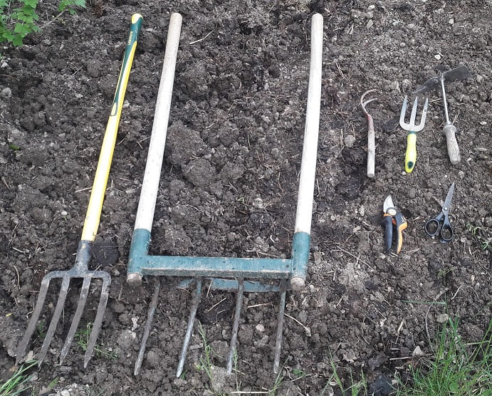 La grelinette est un outil très utilisé. Elle permet de travailler le sol en profondeur (20-30 cm). Elle coûte une centaine d’euros mais bouleverse peu le vivant du sol et reste un outil utilisable par beaucoup de jardiniers.